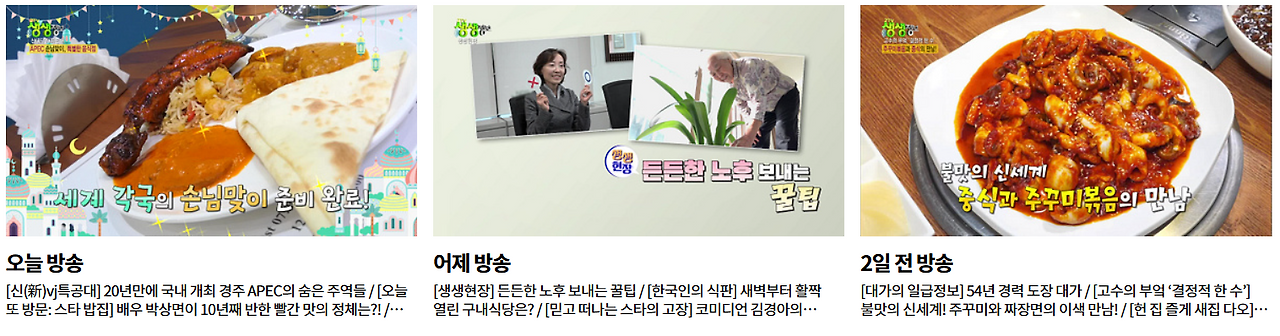 생생정보통 프로그램 페이지에서는 방송 직후 다음 정보를 확인할 수 있습니다.