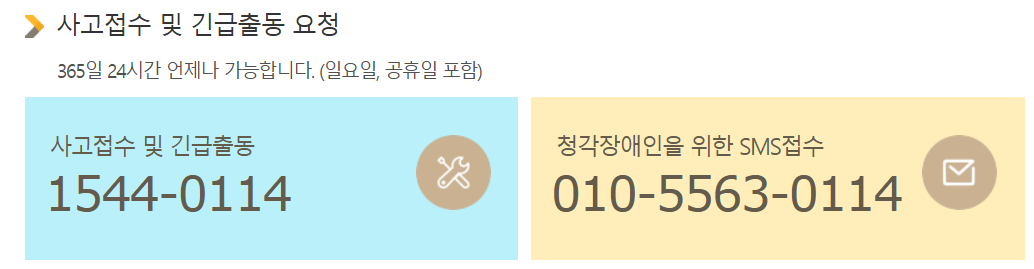 - 사고접수 및 긴급출동: 1544-0114